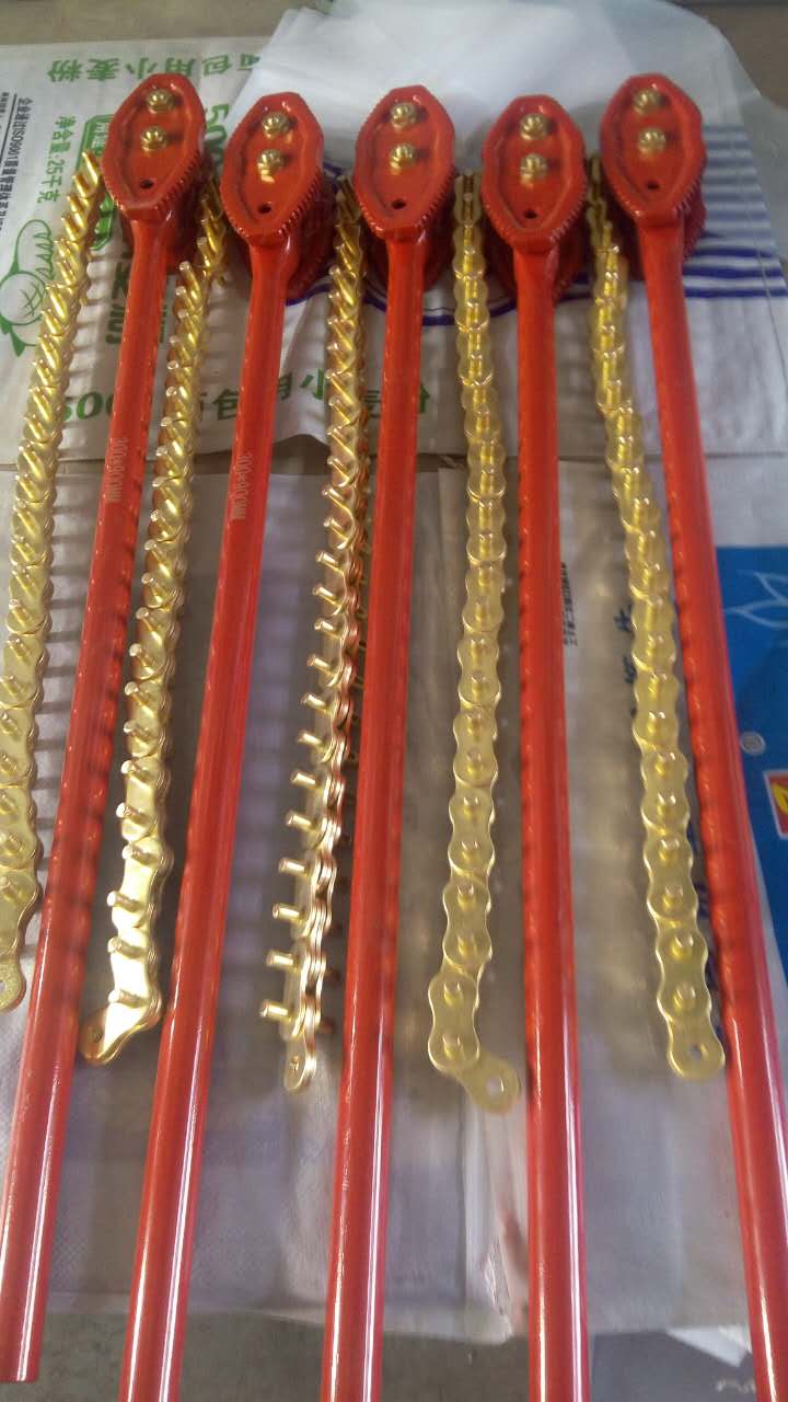 海誠(chéng)防爆工具之防爆鏈?zhǔn)焦茔Q,該產(chǎn)品包含鉗柄和一端與鉗柄鉸接的鏈條,鉗柄的前端設(shè)有與鏈條嚙合的牙。進(jìn)一步地促進(jìn),鏈條通過聯(lián)結(jié)板與鉗柄鉸接,即鏈條的一端與聯(lián)結(jié)板的一端鉸接,聯(lián)結(jié)板的另一端與鉗柄鉸接。鉗柄的前端的牙呈圓弧分布。防爆鏈?zhǔn)焦茔Q在工作時(shí),鏈條的非鉸接端是自由的、不與鉗柄固定或鉸接,管件的夾持、旋轉(zhuǎn)是由管件和纏繞它的鏈條之間的摩擦力來實(shí)現(xiàn)的,而扭力是由鉗柄前端的局部牙輪與鏈條的嚙合力產(chǎn)生的,鉗柄在管件表面沒有施力作用點(diǎn)。因此,本實(shí)用新型防爆鏈?zhǔn)焦茔Q克服了現(xiàn)有鏈條式管鉗的不足之處,不但能對(duì)金屬管件,而且能對(duì)陶瓷管件、薄壁管件、塑料管件等進(jìn)行夾持、旋轉(zhuǎn),并不產(chǎn)生咬痕,不損傷管件表面。規(guī)格:600*100、600*150、900*200、900*300mm,防爆鏈?zhǔn)焦茔Q材質(zhì)分別為:鈹青銅,鋁青銅。防爆鏈?zhǔn)焦茔Q為無(wú)火花工具這種工具工作在連續(xù)的敲擊、摩擦、沖擊、撞擊的過程中都不會(huì)因?yàn)橄嗷ブg的碰撞而產(chǎn)生火花,特別適合于在易燃、易爆、強(qiáng)磁及腐蝕性工作場(chǎng)所里使用,比如說:軍工、化工、石油、石化、礦山、煤礦、電子、采氣場(chǎng)所等這些特殊的場(chǎng)所里使用。