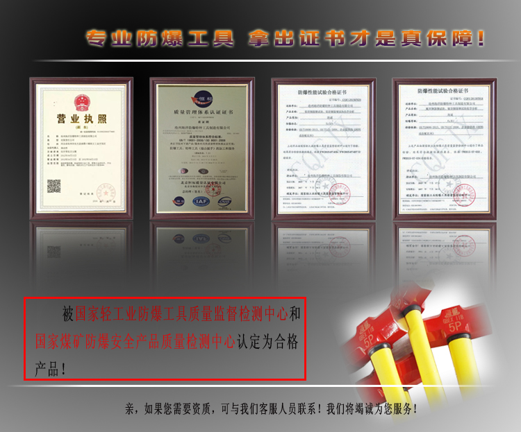 防爆工具以銅合金為主材質(zhì),因?yàn)殂~本身相對(duì)較軟,在與其他物體撞擊和摩擦?xí)r不容易產(chǎn)生微小的金屬顆粒。這也是我們?cè)谑褂脮r(shí)看不到火花的原因。因此我們又把防爆工具稱之為無(wú)火花工具。防爆工具的使用范圍廣,在石油精煉和石油化學(xué)工業(yè)、煤礦、油田、天然氣化學(xué)工業(yè)、火藥工業(yè)、化纖工業(yè)、油漆工業(yè)、肥料工業(yè)、各種藥品工業(yè)。石油輪和液化石油氣的車輛、飛機(jī)、經(jīng)營(yíng)易燃易爆品的倉(cāng)庫(kù)、電解車間、通訊機(jī)裝配車間、要求工具不生銹、耐磨抗磁的場(chǎng)所等。闡述防爆工具的制作工藝:一、【鍛造工藝】際新制造工藝,是利用大型壓力機(jī)或沖床,配合高耐熱成形模具一次性鍛壓制成?!惧懺旃に噧?yōu)點(diǎn)】能使產(chǎn)品密度、硬度、抗拉強(qiáng)度、扭力大大提高,基本杜絕氣孔、沙眼,使產(chǎn)品機(jī)械性能使用壽命比傳統(tǒng)鑄造工藝長(zhǎng)1倍左右。 缺點(diǎn):產(chǎn)品設(shè)備、模具投資較大,致使成本較高。二【鑄造工藝】屬傳統(tǒng)制造工藝,是上世紀(jì)80年代際通用制造防爆工具工藝技術(shù),在內(nèi)大多數(shù)防爆工具生產(chǎn)企業(yè)一直延用至今?!捐T造工藝優(yōu)點(diǎn)】工藝簡(jiǎn)單、制造成本低。缺點(diǎn):產(chǎn)品密度、硬度、抗拉強(qiáng)度、扭力較低,氣孔、沙眼較多導(dǎo)致產(chǎn)品使用壽命較短。
